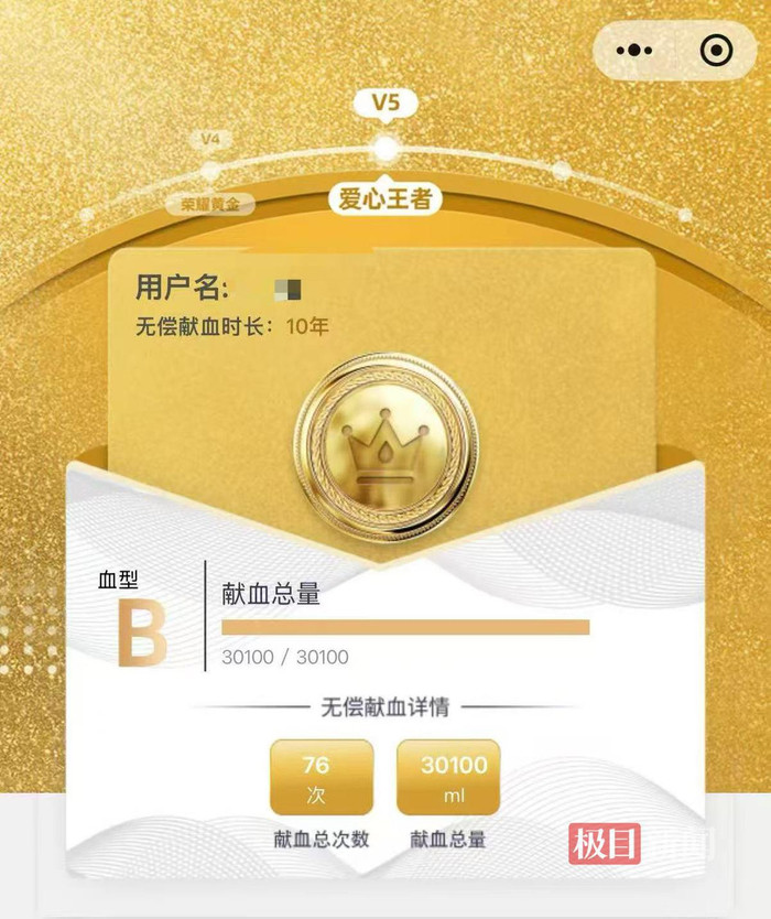 28岁,10年来,无偿献血76次,总量达30100毫升。1月29日,山东德州的王女士在社交平台分享了自己的献血经历,获得众多网友点赞。1月30日,王女士告诉极目新闻记者,除孕期和哺乳期外,她10年来一直坚持献血,最初献全血,2018年7月后转为捐献成分血,并称只要身体允许就会继续下去。
